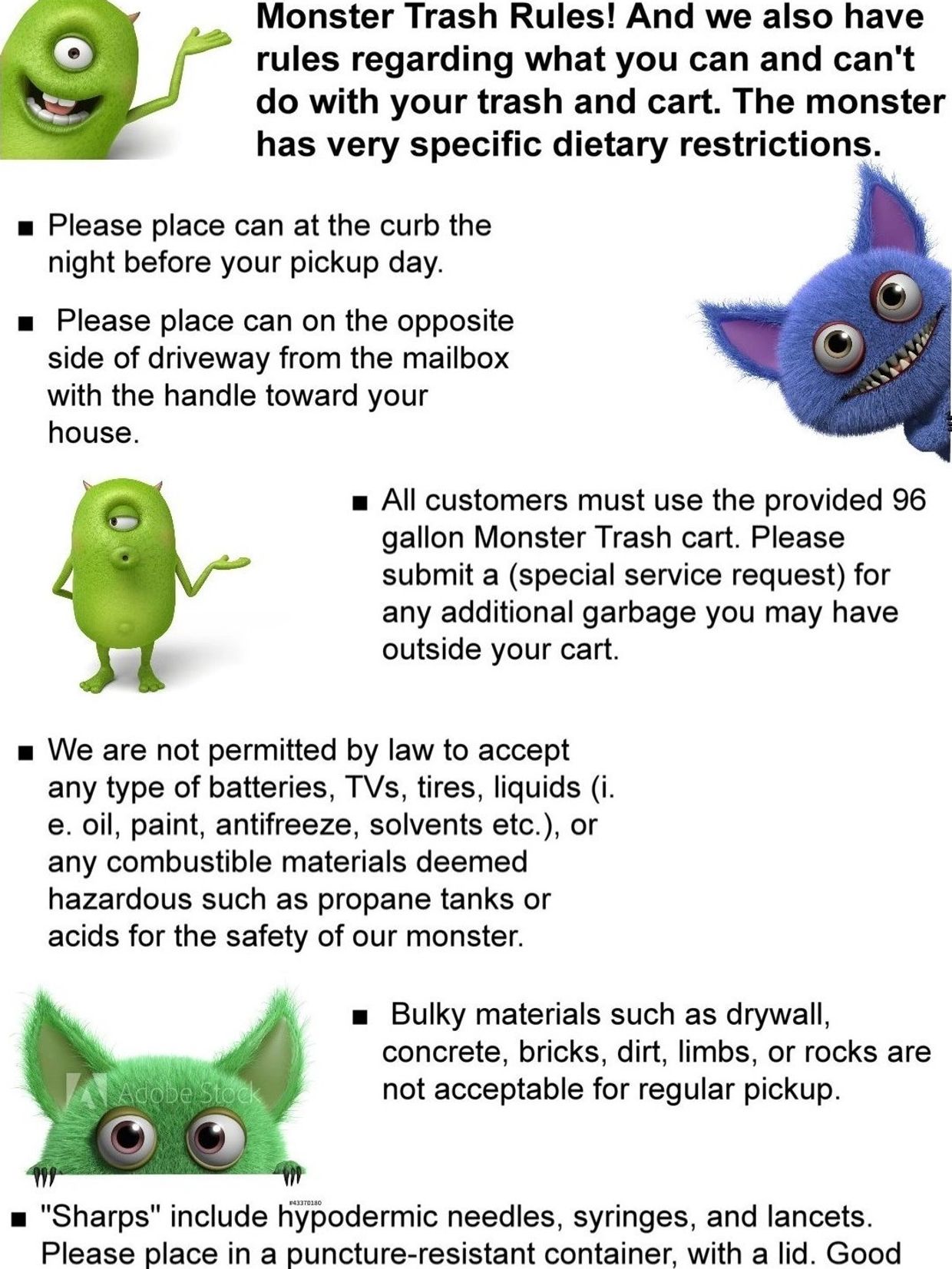 Due to the New Year holiday, Monster Trash will be closed Thursday, January 1st. Trash customers with a service day on Thursday, 1/1/2026, will be serviced on Friday, 1/2/2026. Friday customers will be serviced on Saturday 1/3/2026. Have a wonderful and safe holiday!!!